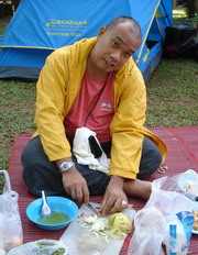 เราเริ่มกางเต้นต์ก่อนเลยครับพี่น้อง หาทำเลที่ดี มาก่อนคนอื่นก็ต้องได้เลือกก่อน ทำเล ที่ดี นั้น ลง ความเห้นว่า ต้อง ร่มรื่น วิวดี การคมนาคมสะดวก ผมชอบจริงๆเลยอันหลังเนี่ย มันใกล้กับทางไปเล่นน้ำตก ใครไปใครมา ก็ต้องผ่านตรงผม จะได้รอดูสาวๆ ผ่านไปมา ได้ คิคิ.. เราเอาเต้นท์ไป 4 เต้นท์ ใช้ระบบการนอน 4-4-2-2 นั่นหละ หลังจากนั้น ก็ ทำอาหารกินกัน หุงข้าวหาปลามากิน อ่อไปซื้อปลาแรด มา 2 ตัว ตัวเอ้บเลย อร่อยด กินกันเรียบร้ย ก็นอนซฺ ใคร ใครนอนก็นอนไป ใครเดินเล่นก็เล่นไป ส่วนคนที่ นนก็จะมี พลขับทั้งหลาย อย่าง ฮารูณ อารีฟีน แล้วก็ ฟิกแบะ ปล่อยมันนอนไป ที่เหลือนี่ ซิ หนุ่มมันก็ไป สำรวจ อะไรมันไปเรื่อย ส่วน ผมเองนั้น ก็ทำกิจกรรมอย่างที่เคยทำบ่อยๆ อากาศดีดี แบบนี้หาที่ไหนได้ ซลา จุดถ่าน ฮากีมประกอบเตาบารากู่ การประกอบหรือตั้งเตาบารากู่ นั้น ใช้เวลาไม่มากเลยนะ เพราะอะไรน่ะเหรอ เพราะเราคือมืออาชีพน่ะซิ พี่น้อง ถ้ามีวุฒิรองรับก็น่าจะได้ ด้อกเตอร์กันแล้วมั้ง